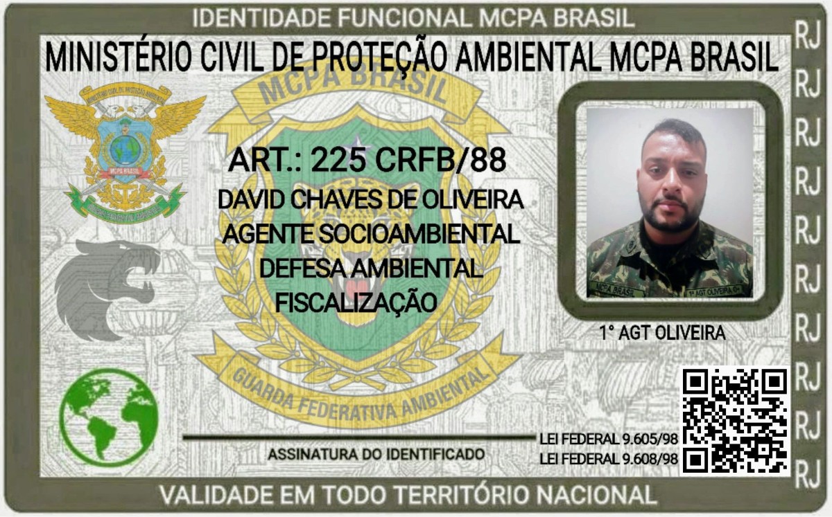 Sr. David Chaves de Oliveira, Formação Agente Ambiental, Registrado na Defesa Civil do Estado do Rio de Janeiro, com Subordinação das Forças Armadas, Exército, Marinha, Aeronáutica, Socorrista, Especialista em Abrigos, Especialista em Combate a incêndio florestal, Monitor Ambiental, Vigilante Registrado na Policia Federal, Registrado no Conselho Nacional de Meio Ambiente - CONAMA.