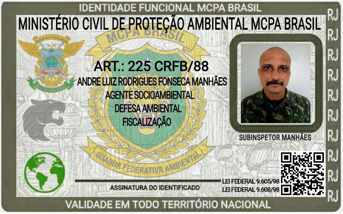 Sr. Andre Luiz Rodrigues Fonseca Manhães, Formação Agente Ambiental, Registrado na Defesa Civil do Estado do Rio de Janeiro, com Subordinação das Forças Armadas, Exército, Marinha, Aeronáutica, Especialista em Abrigos, Especialista em Combate a incêndio florestal, Monitor Ambiental, Técnico de Enfermagem, Registrado no Conselho Nacional de Meio Ambiente - CONAMA, Formação de lide de equipe e chefe de guarnição, socorrista, especialista em ronda preventiva.